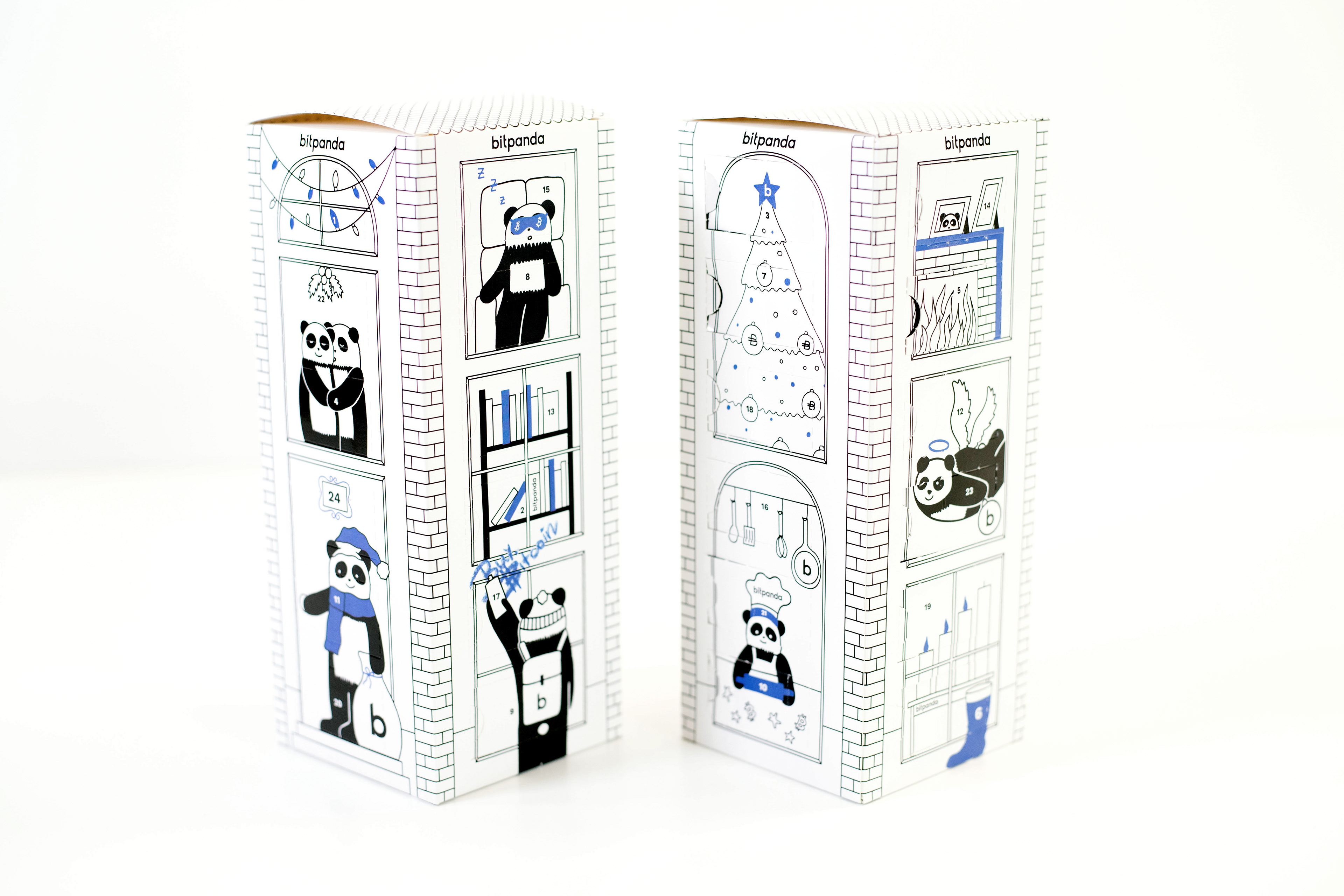 This is the packaging design I did for our Bitpanda Advent Calendar. I wanted to use the shape of the packaging and created a house with pandas in different windows. If you look very closely you will notice a lot of small details :)